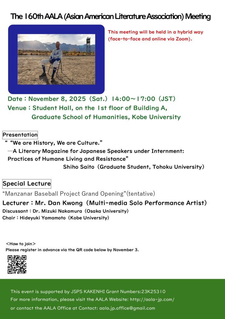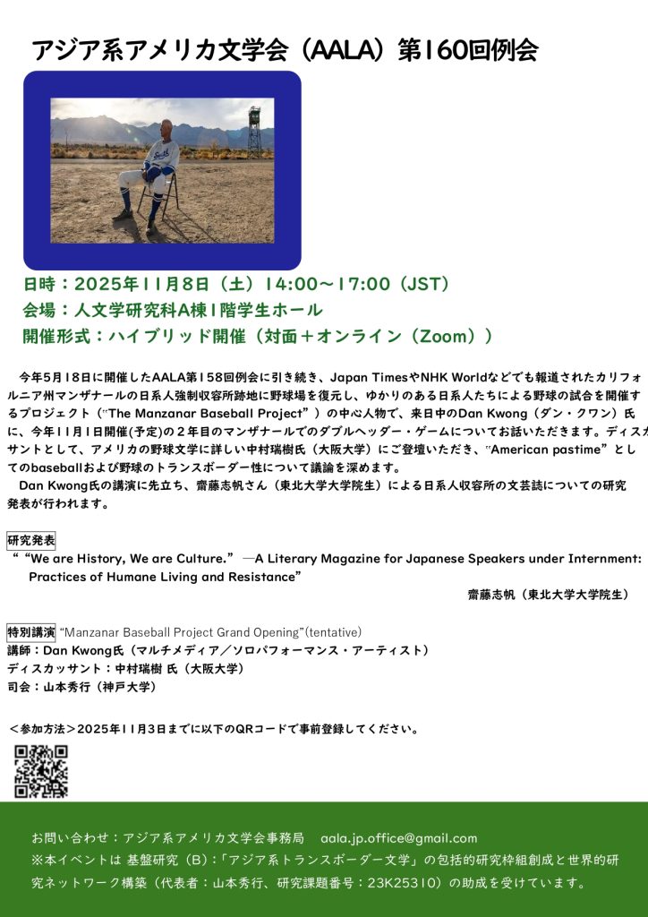 今年5月18日に開催したAALA第158回例会に引き続き、Japan TimesやNHK Worldなどでも報道されたカリフォルニア州マンザナールの日系人強制収容所跡地に野球場を復元し、ゆかりのある日系人たちによる野球の試合を開催するプロジェクト(‟The Manzanar Baseball Project”)の中心人物で、来日中のDan Kwong(ダン・クワン)氏に、今年11月1日開催(予定)の2年目のマンザナールでのダブルヘッダー・ゲームについてお話いただきます。ディスカッサントとして、アメリカの野球文学に詳しい中村瑞樹氏(大阪大学)にご登壇いただき、‟American pastime”としてのbaseballおよび野球のトランスボーダー性について議論を深めます。Dan Kwong氏の講演に先立ち、齋藤志帆さん(東北大学大学院生)による日系人収容所の文芸誌についての研究発表が行われます。